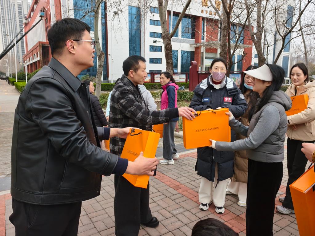 王春生、杨晨为女教职工送上节日礼品表达祝福。