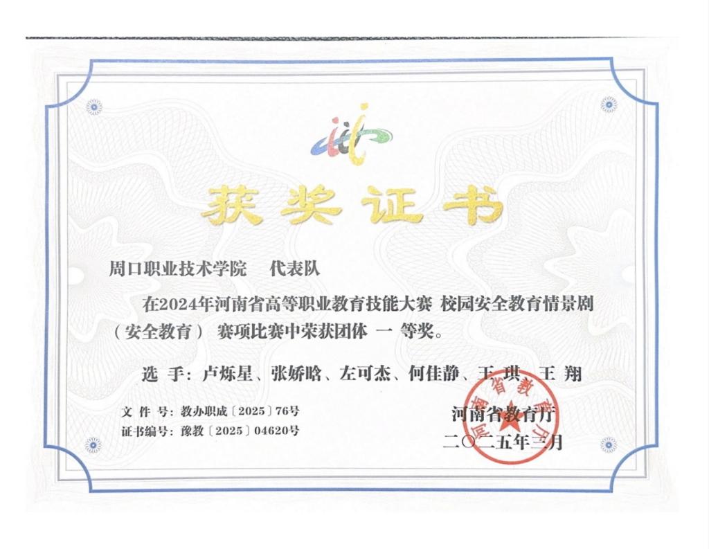 2025年3月1日,在河南省高等职业教育技能大赛中,我院学生沉着应战、精益求精,凭借扎实的专业功底与稳定出色的临场发挥,斩获大赛一等奖。生动展现了学院在高素质技术技能人才培养上的扎实成效。