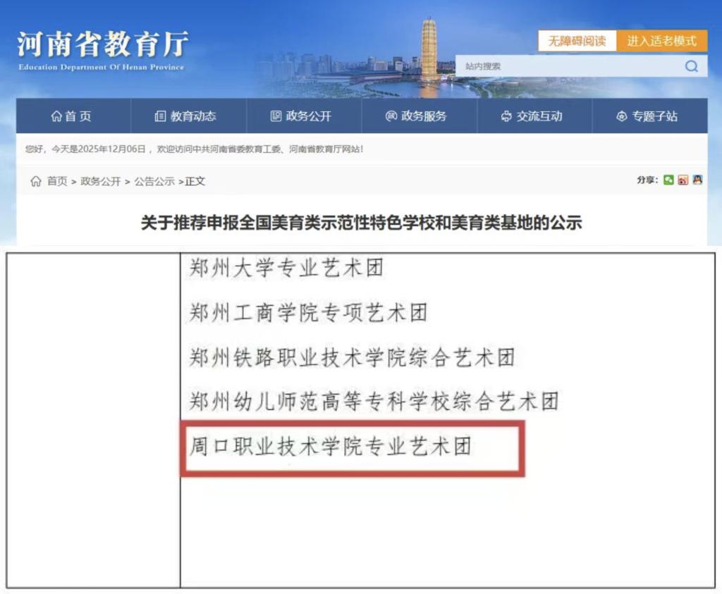 2025年12月7日,我校成功入选全国美育类示范性特色学校推荐名单。这标志着学校美育建设工作取得重要阶段性成果,并获得了省级层面的充分认可与肯定。未来,我校将持续深化美育育人实践,以美润心、以艺育人,不断夯实美育根基,助力学生全面成长成才。