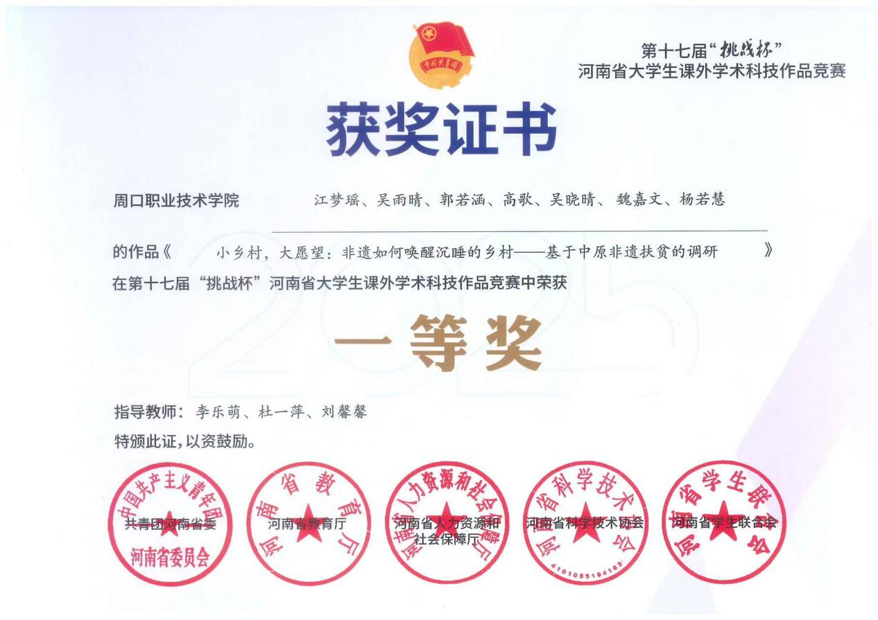 2025年12月8日,在第十七届“挑战杯”河南省大学生课外学术科技作品竞赛中,我院学生团队凭借优秀的学术作品与突出的实践能力,荣获一等奖。这一成绩充分展现了学院在科技创新人才培养方面的扎实育人成效。