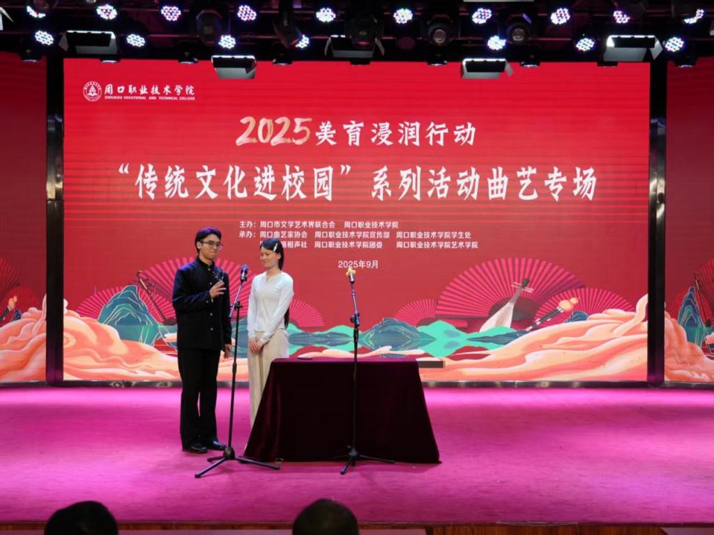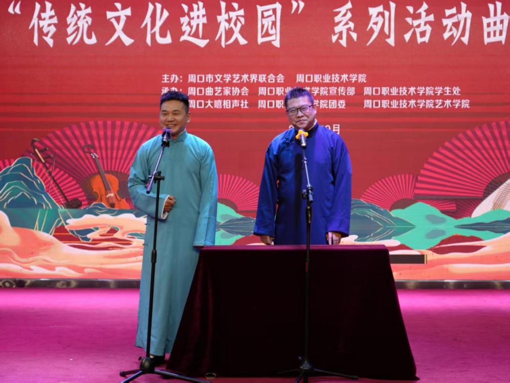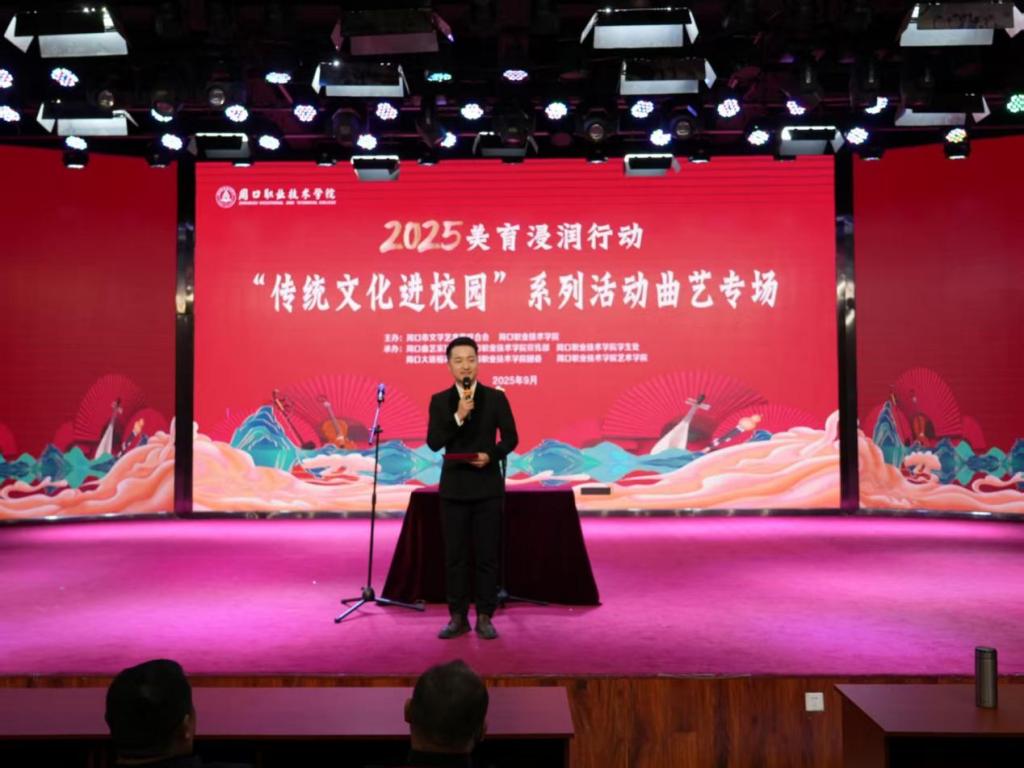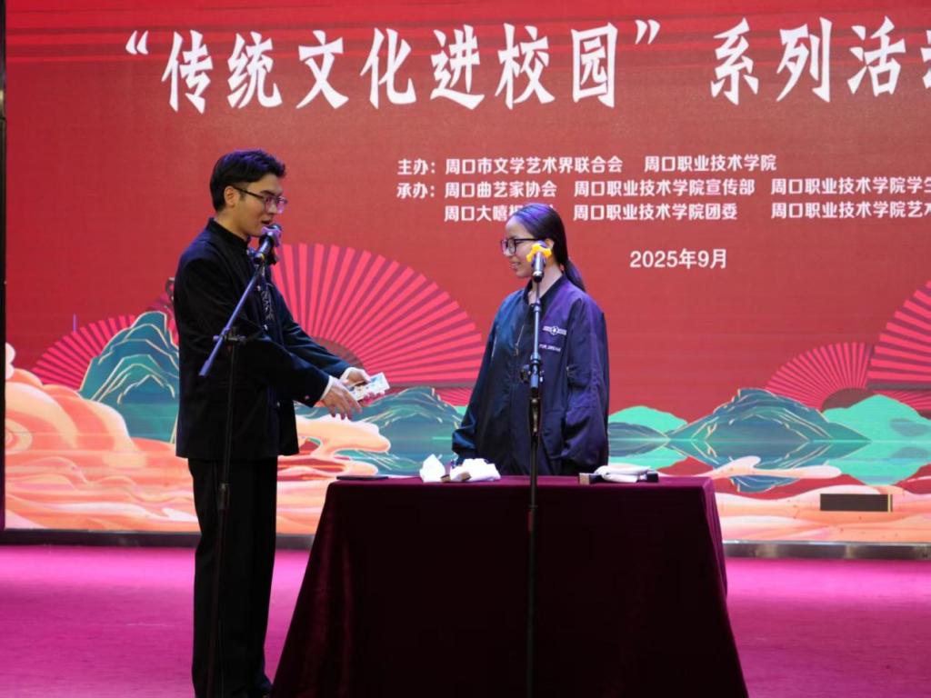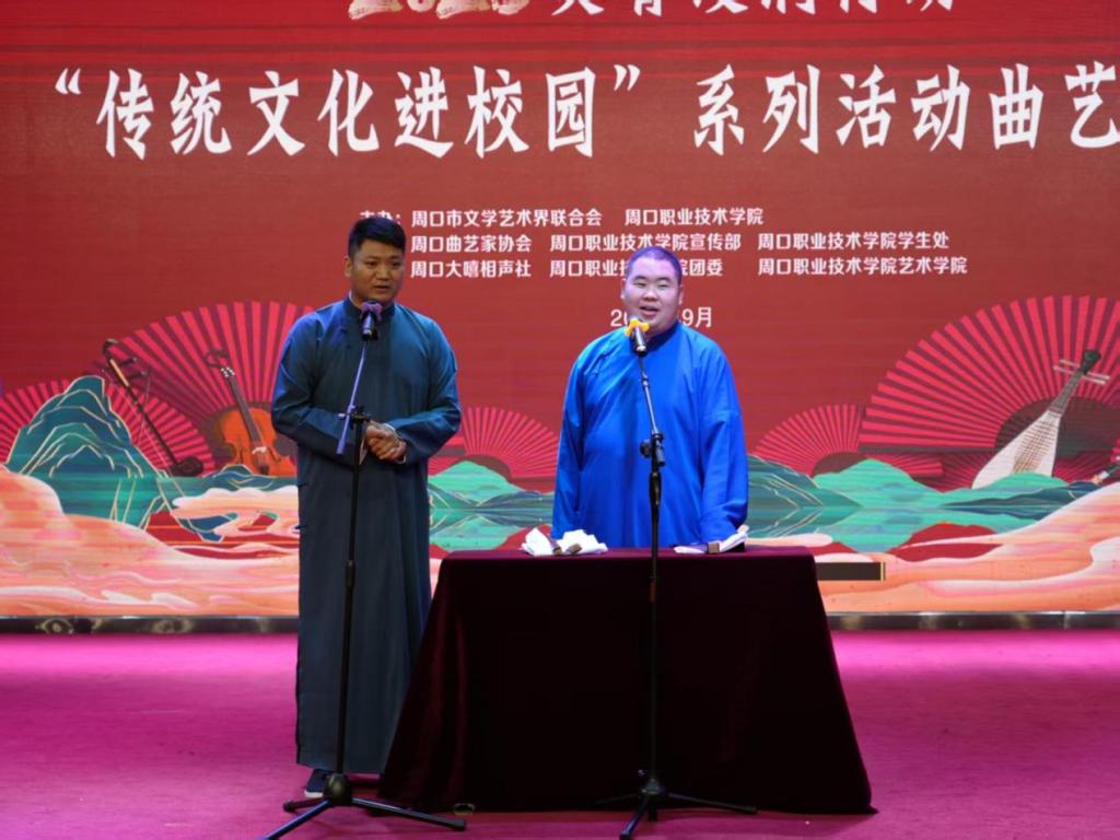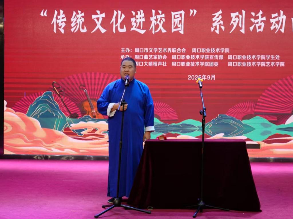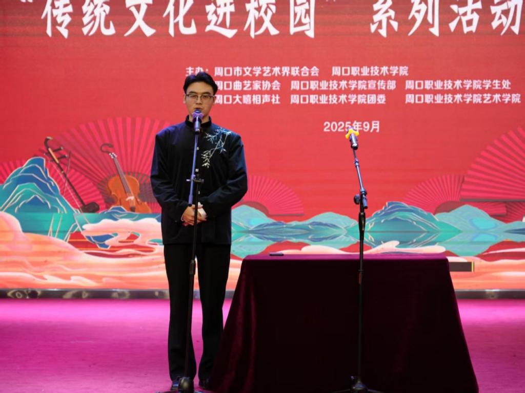 为传承中华优秀传统文化,丰富校园文化生活,9月25日晚,周口曲艺协会、周口大嘻相声社携手走进周口职业技术学院,共同呈现2025美育浸润行动“传统文化进校园”系列活动曲艺专场,在艺术演播厅精彩开演。校党委副书记李明臣、副校长王隼,周口市文联副主席齐红海,周口市曲艺家协会副主席王壹民及学校多位领导嘉宾莅临活动现场,与师生共赏这场曲艺文化的视听盛宴。活动由朱永亮主持。