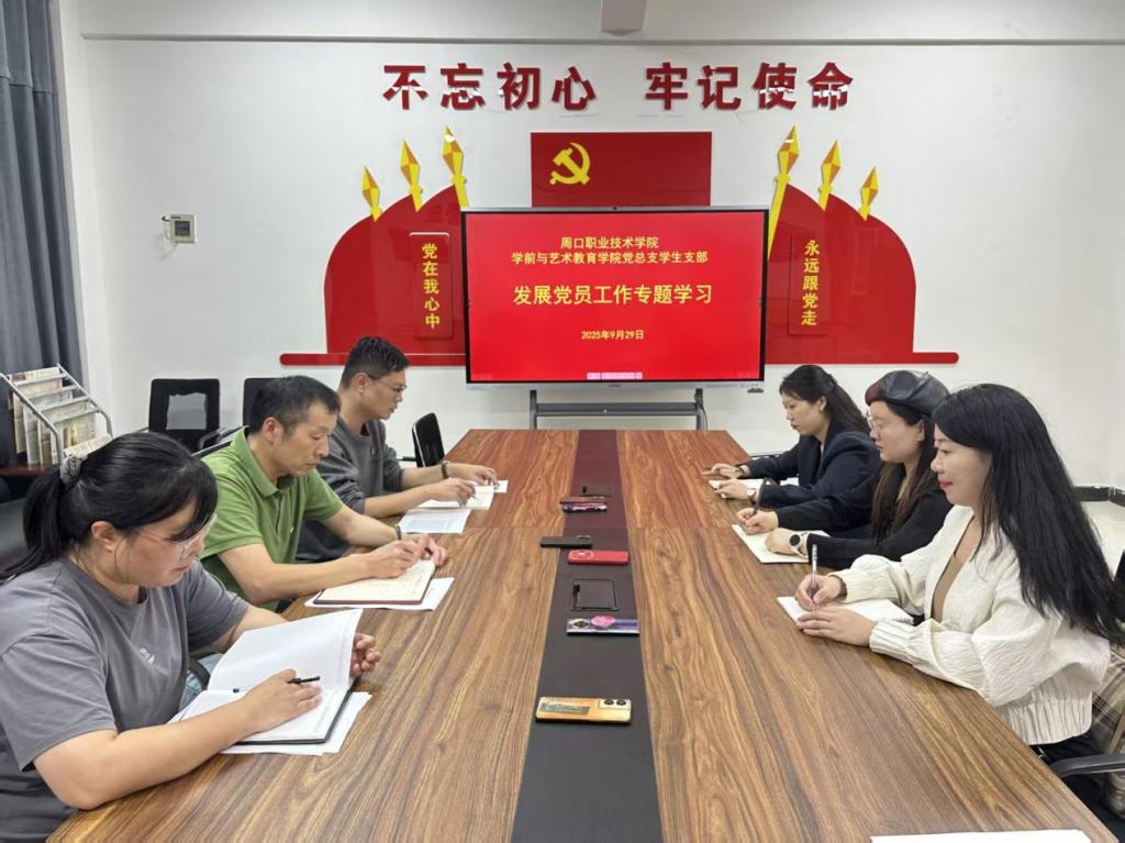 为确保党员发展质量与政治纯洁性,进一步规范组织建设,推动党建工作高质量发展。9月29日,学前与艺术教育学院党总支学生支部在四楼党员活动室召开发展党员工作专题学习会,集中学习《中国共产党发展党员工作细则》。学院党总支书记王春生主持会议。