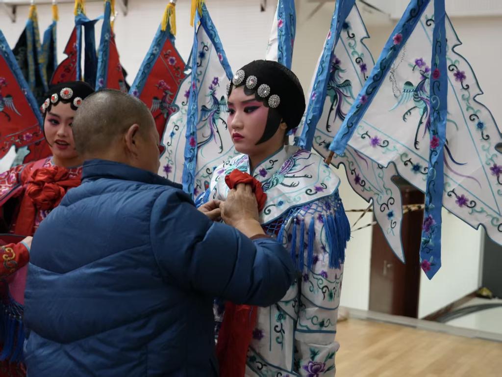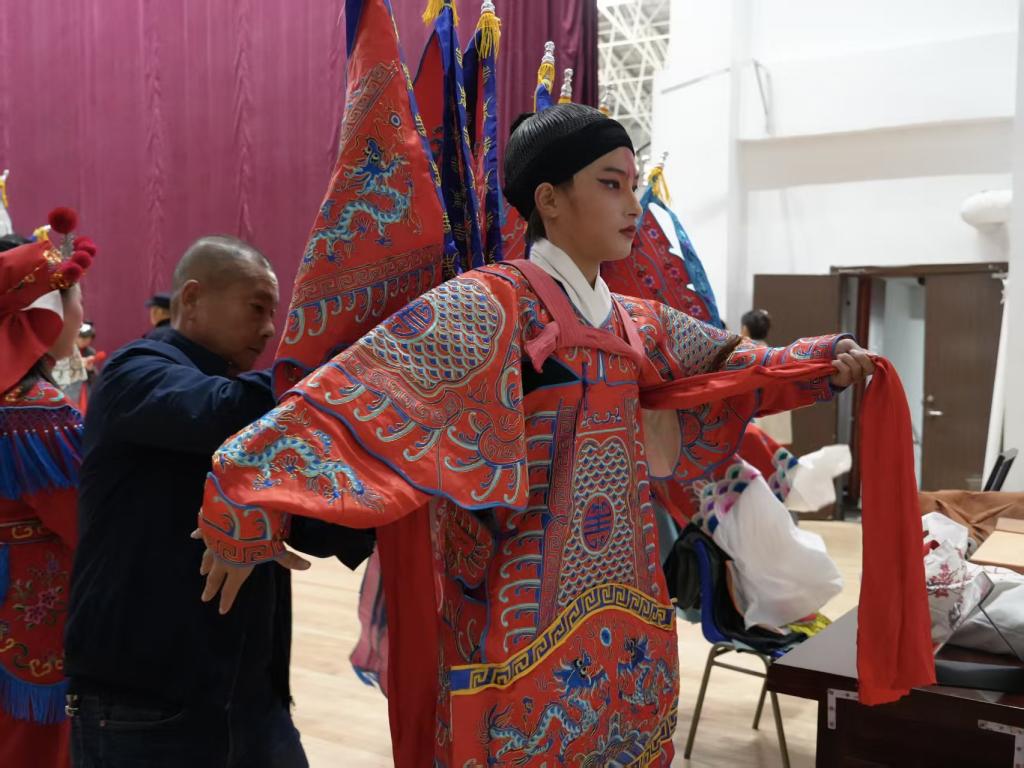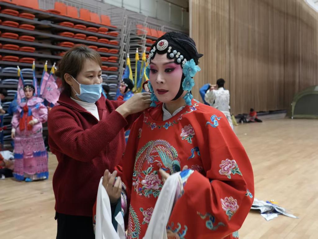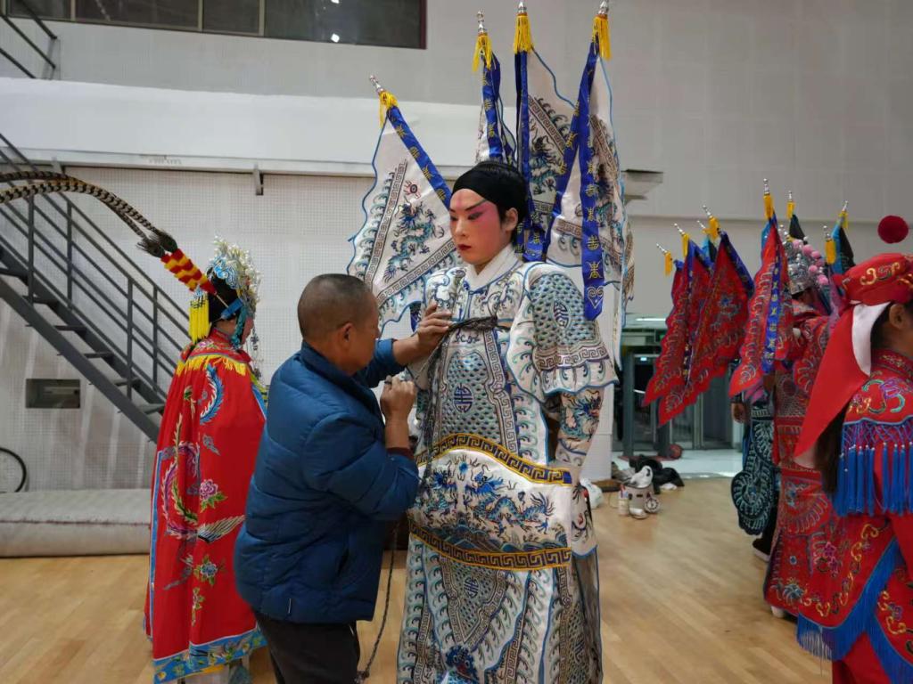 为呈现最佳舞台效果,后台的准备工作尽显学子们专业与专注:师生反复打磨肢体细节、调整队形站位,确保每个动作精准到位;同时,大家细致检查戏服与头饰,演员之间互助妆造,整个协作过程中满是温暖。