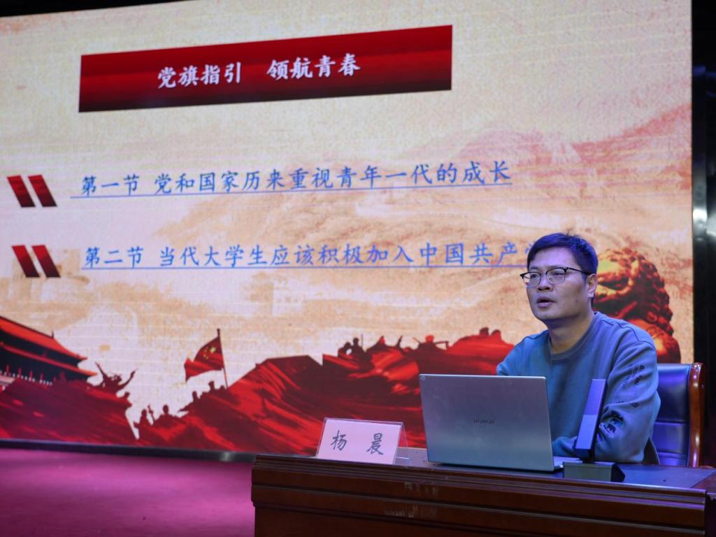 学院学生党支部书记、副院长杨晨以“党旗指引,领航青春” 为题,为入党积极分子讲授专题党课,引导青年学子在党旗指引下坚定理想信念,让青春在新时代绽放光彩。