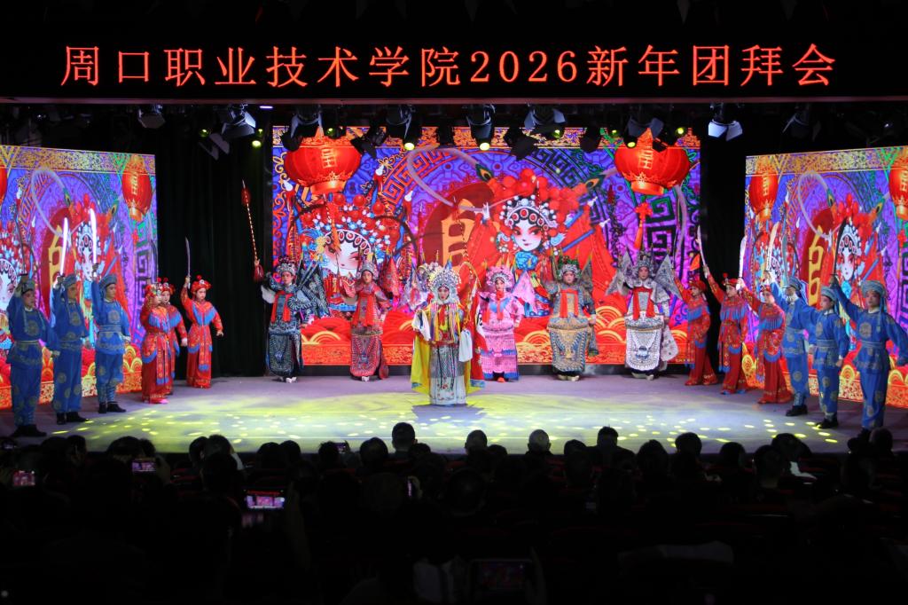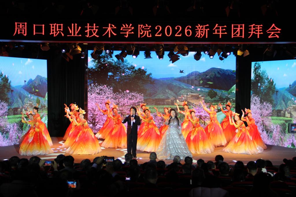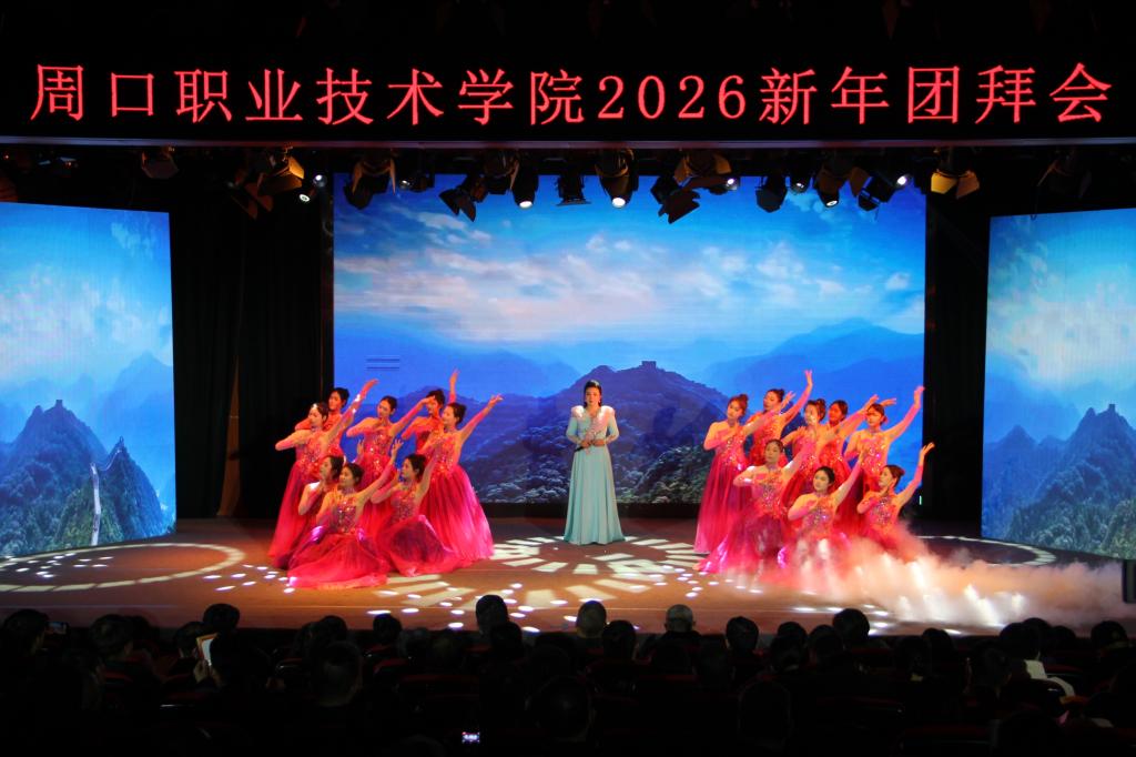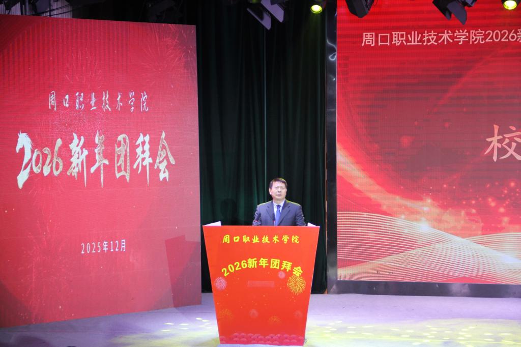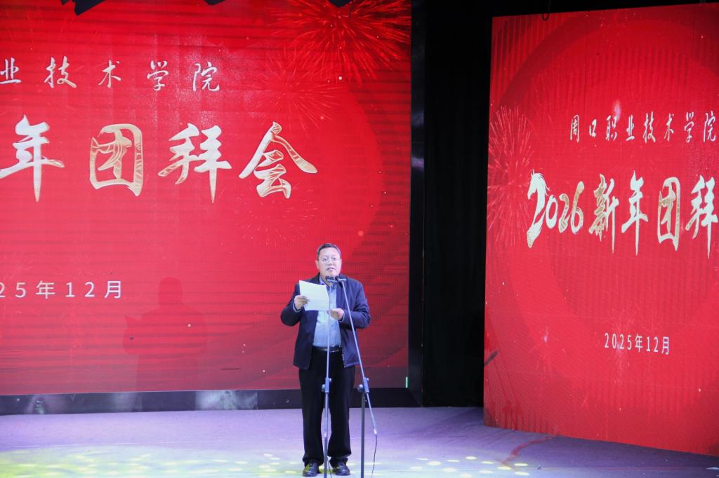 金蛇辞旧岁,骏马踏春来。12月30日下午,由我院承办的周口职业技术学院2026新年团拜会在开元校区砺德厅隆重举行。周口职业技术学院校长李清臣,校党委副书记、工会主席郭汝礼,副校长李秀萍、于爱霞,校纪委书记、监察专员李向东出席团拜会。学校全体中层干部、退休老同志代表及800名师生代表参加团拜会。活动由校党委副书记李明臣主持。