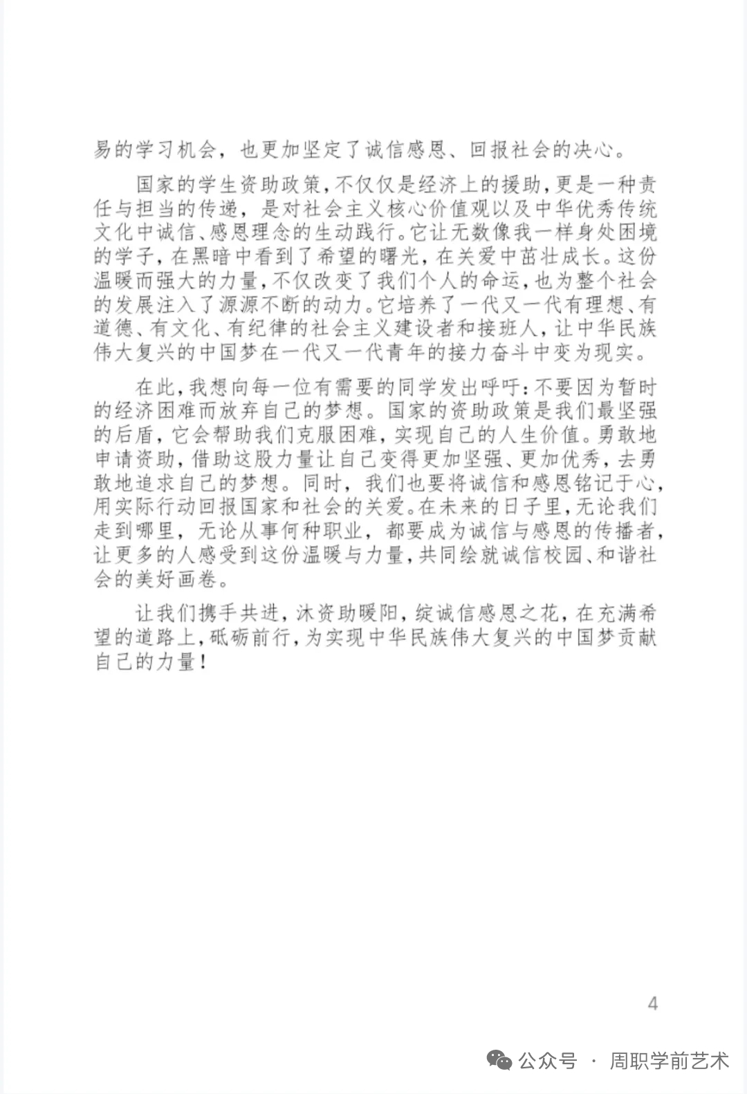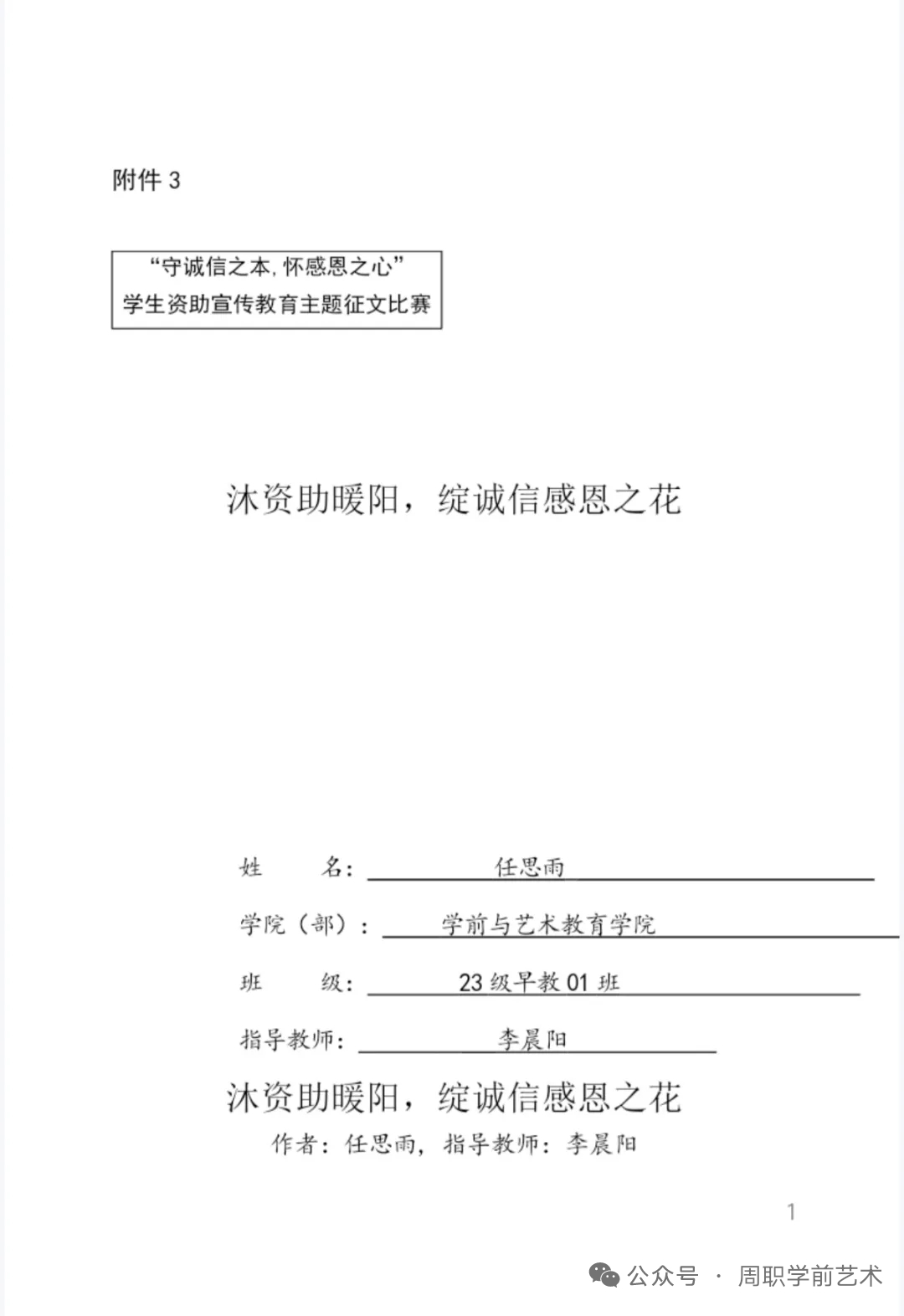 为弘扬资助育人政策,激发学生创作热情,用文字传递诚信力量与资助感恩情怀。5月9—15日,学前与艺术教育学院(纺织服装学院)组织各班级开展2024—2025学年第二学期资助“两节课”诚信教育活动月之主题征文系列活动。学院全体在校生参加本次活动。