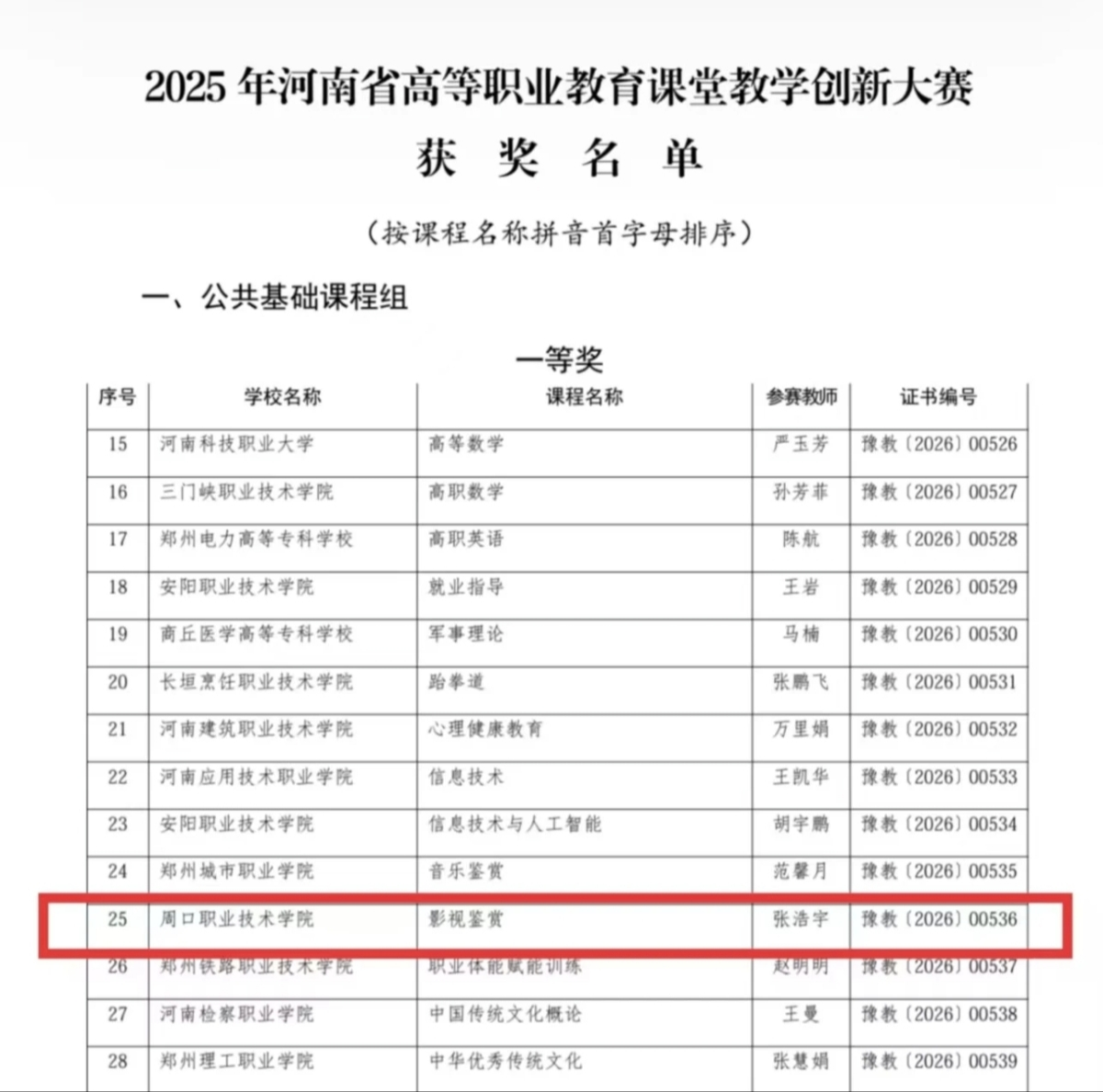 近日,由河南省教育厅主办的2025年河南省高等职业教育课堂教学创新大赛获奖名单公布,我院教师张浩宇《影视鉴赏》课程荣获公共基础课程组一等奖。